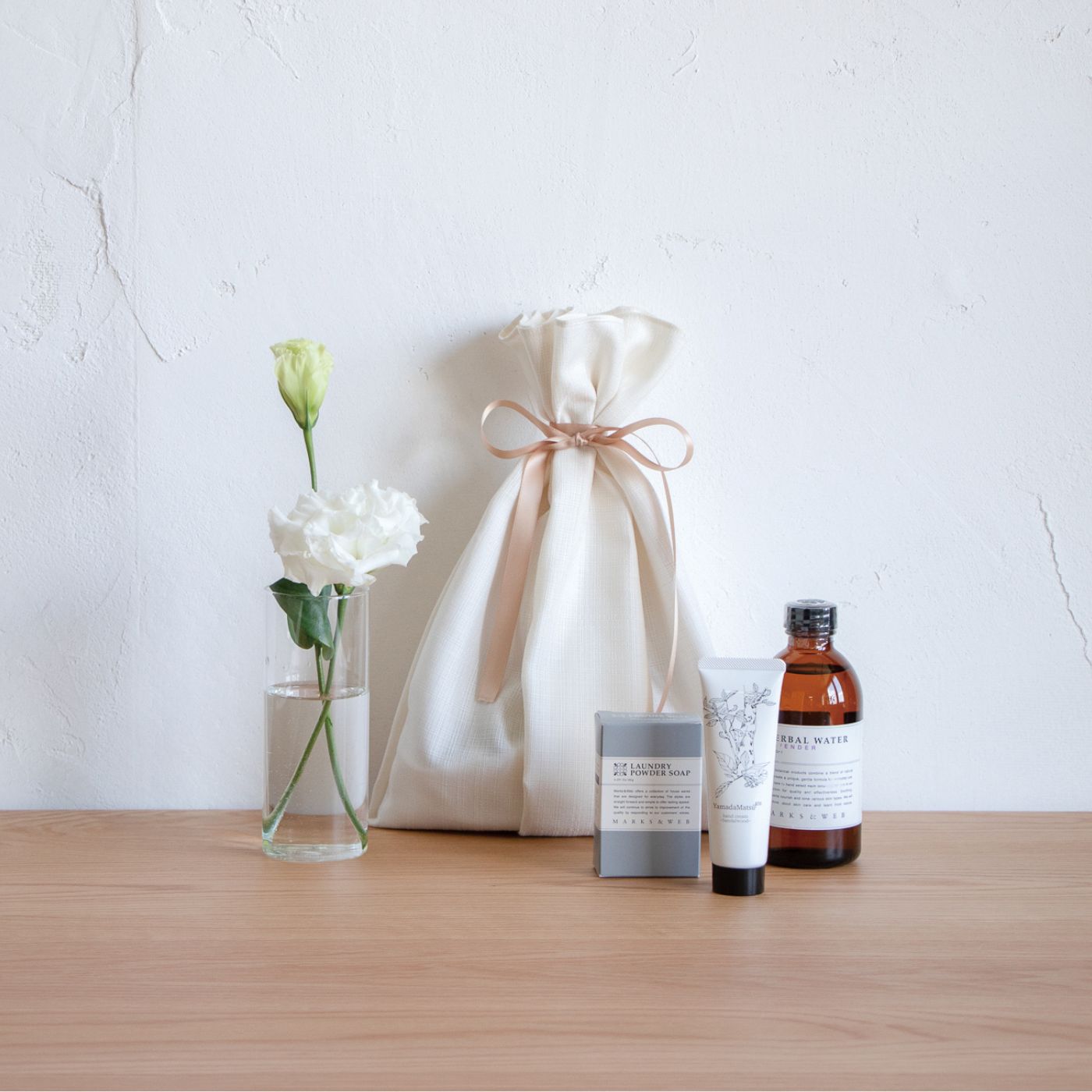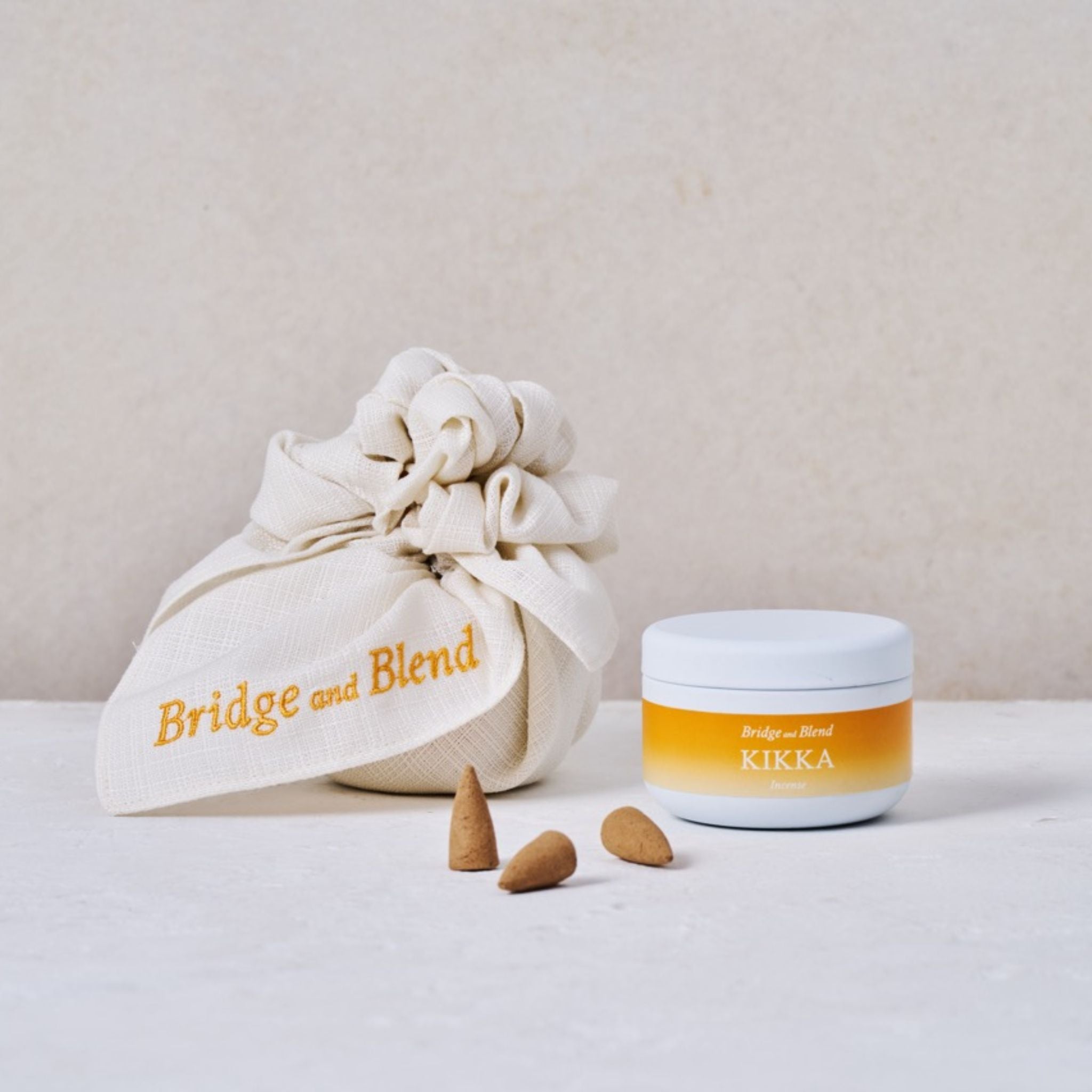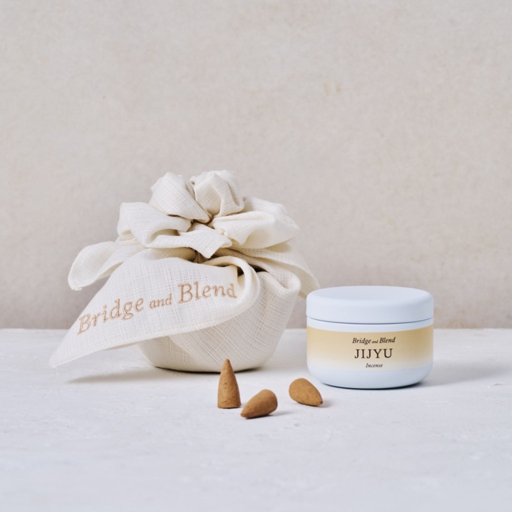3年目を迎える今年、Bridge and Blend は何度も形を変えてリユースできる点でサステナブルラッピングとしてニューヨークタイムズ紙にも取り上げられた京都の風呂敷屋さん「むす美」さんとのコラボ商品で「日本の香り」をつつみました。