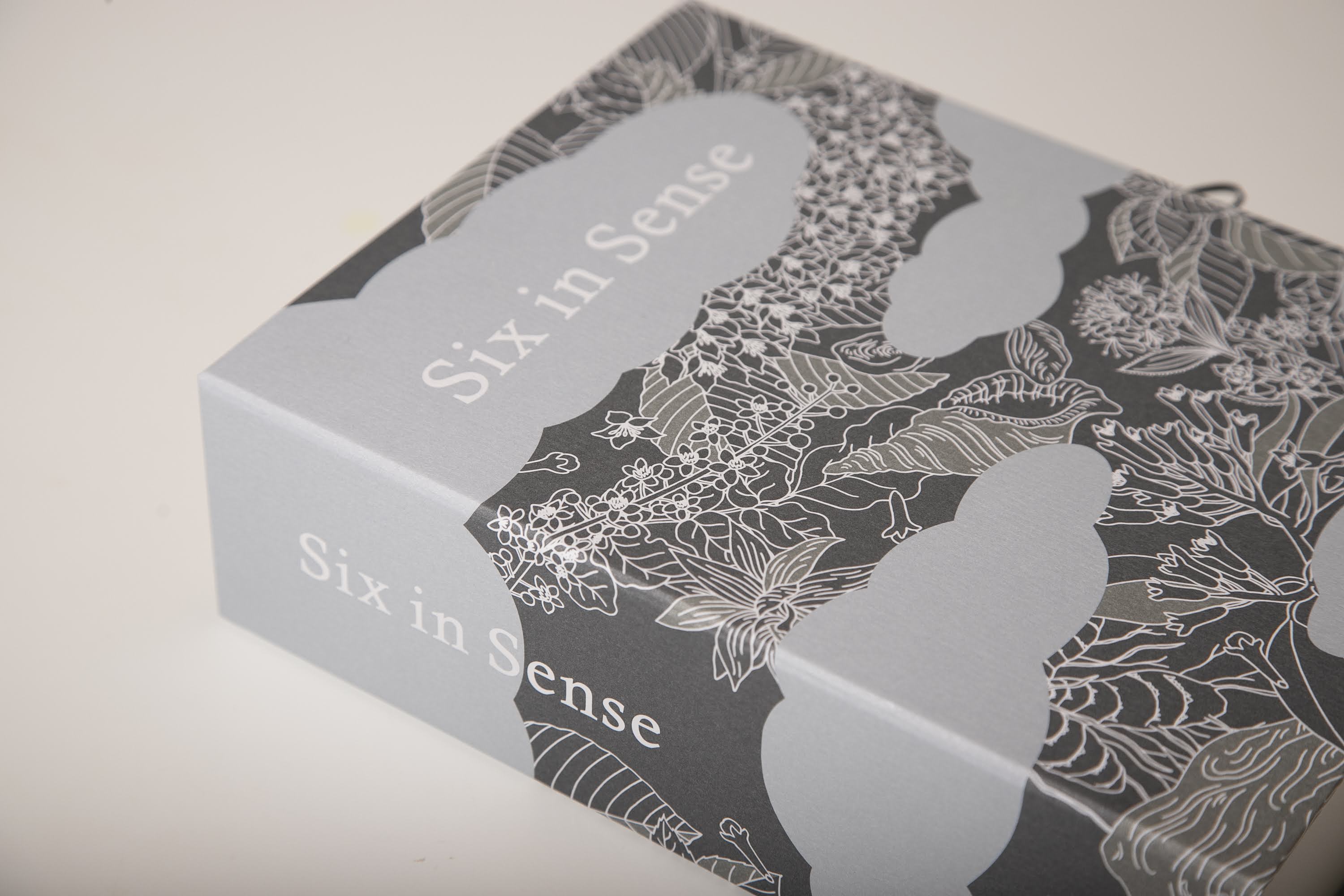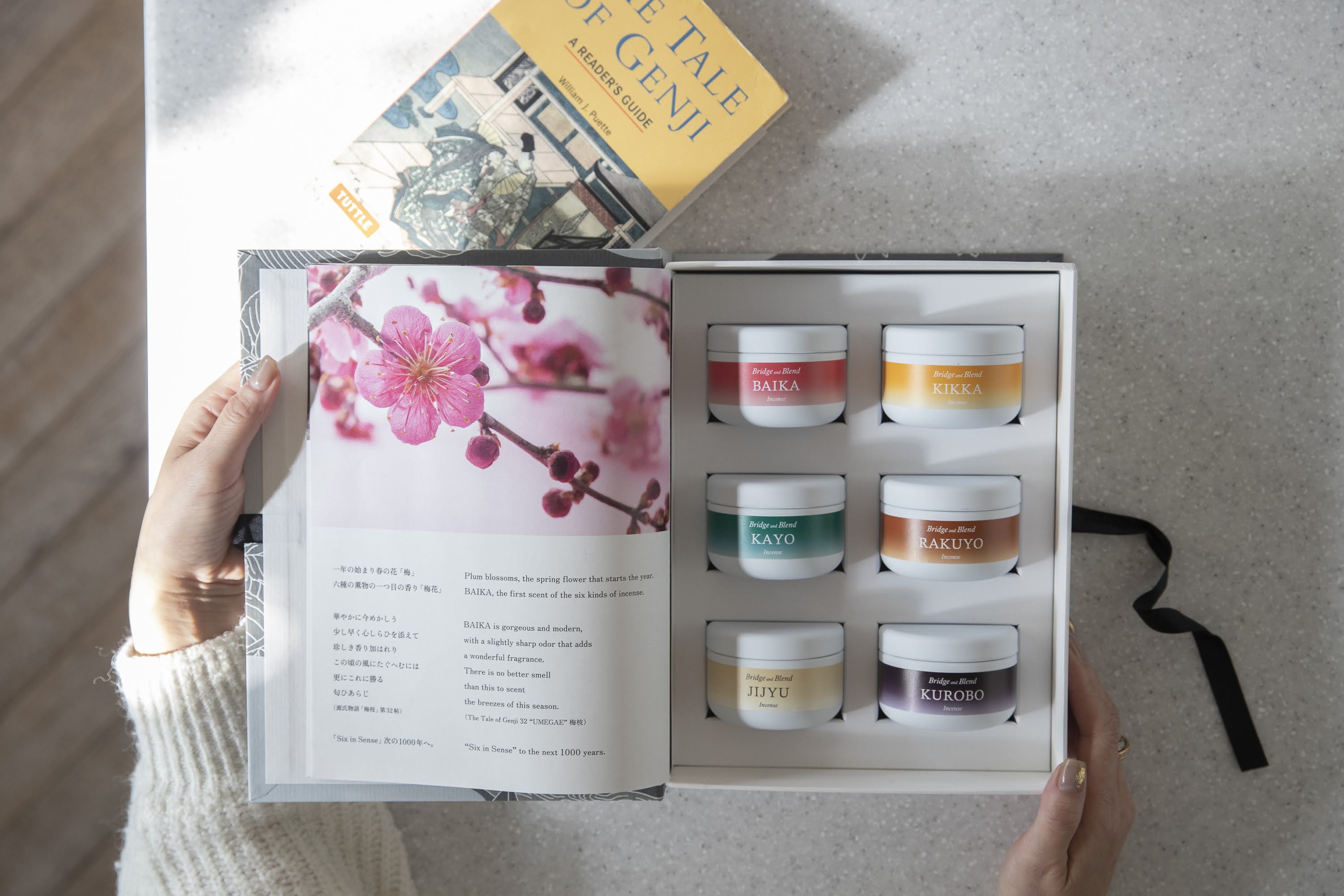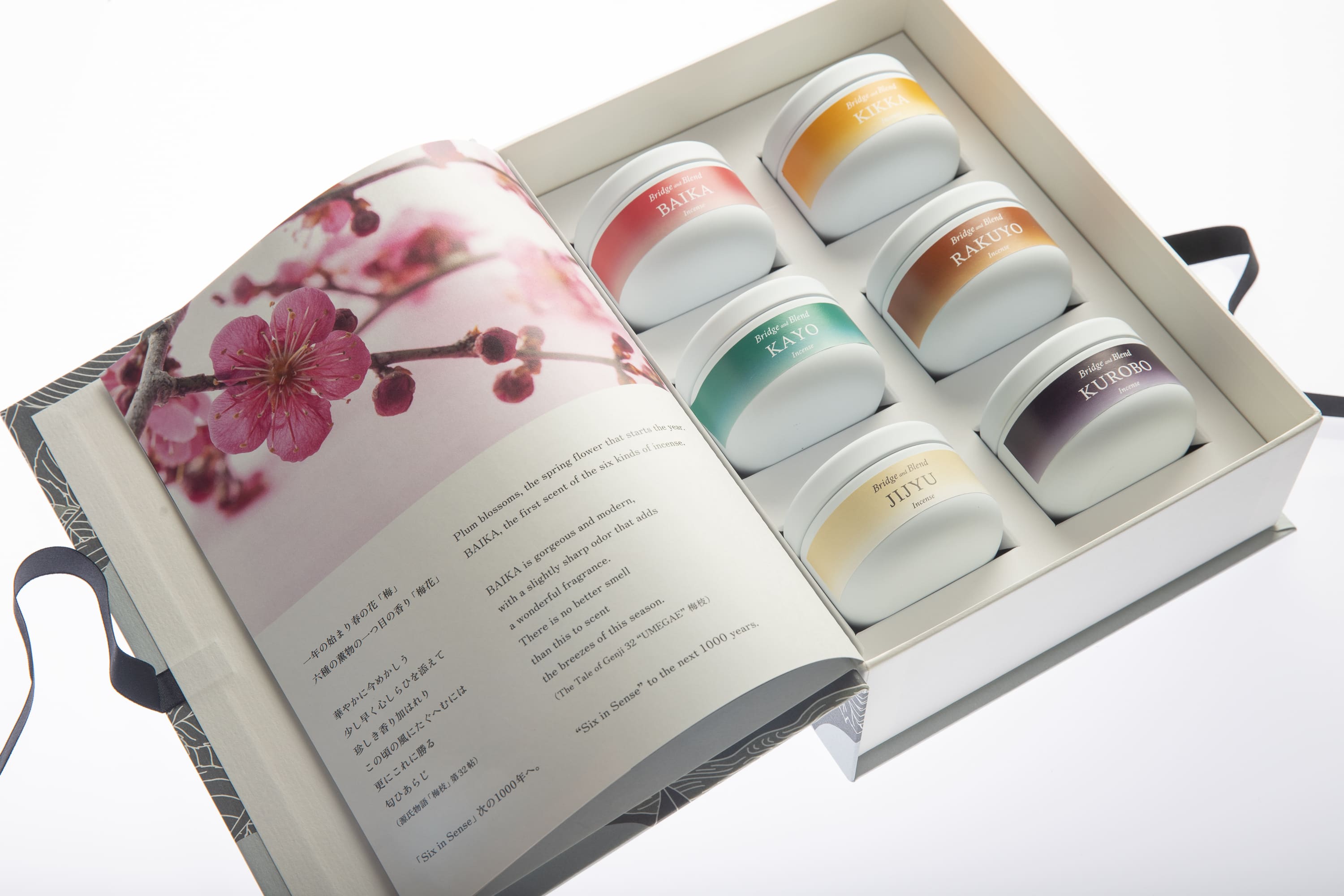 ブランドのグローバルデビュー 1 周年記念に制作した Six in Sense【Anniversary Box】は、源氏物語を模してページを捲りながら日本のお香のストーリーを紐解けるように本型に仕立てました。「世界中から届いた香原料が1000年前の日本で出会い、交わり、日本の香りとして旅立つ」をテーマにしたデザインしました。