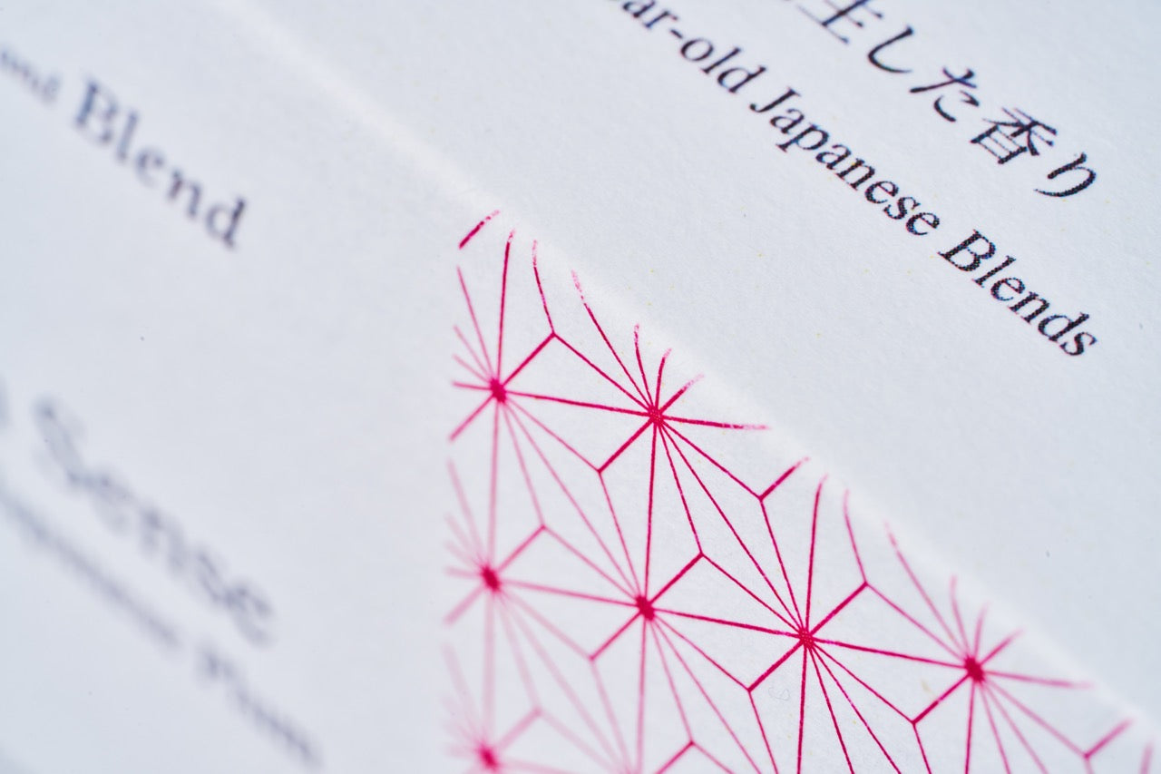 古代紋様の麻の葉を起用。この紋様にはBridge and Blend「Six in Sense」のコーン型お香をモチーフにした三角形と、この度リリースしたスティック型お香の直線が隠れており、俯瞰的に眺めると6つの香りを意図する六角形が浮き上がって見えます。