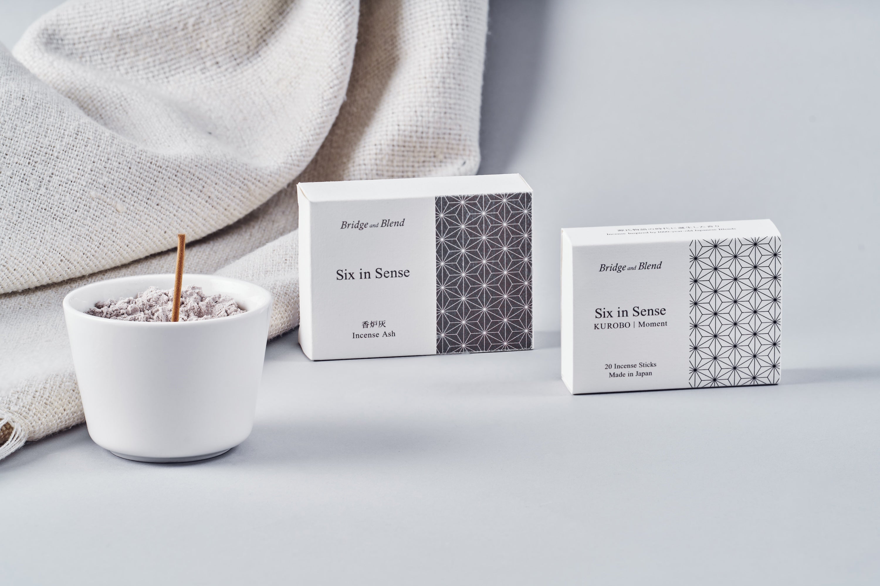 古代紋様の麻の葉を起用。この紋様にはBridge and Blend「Six in Sense」のコーン型お香をモチーフにした三角形と、この度リリースしたスティック型お香の直線が隠れており、俯瞰的に眺めると6つの香りを意図する六角形が浮き上がって見えます。