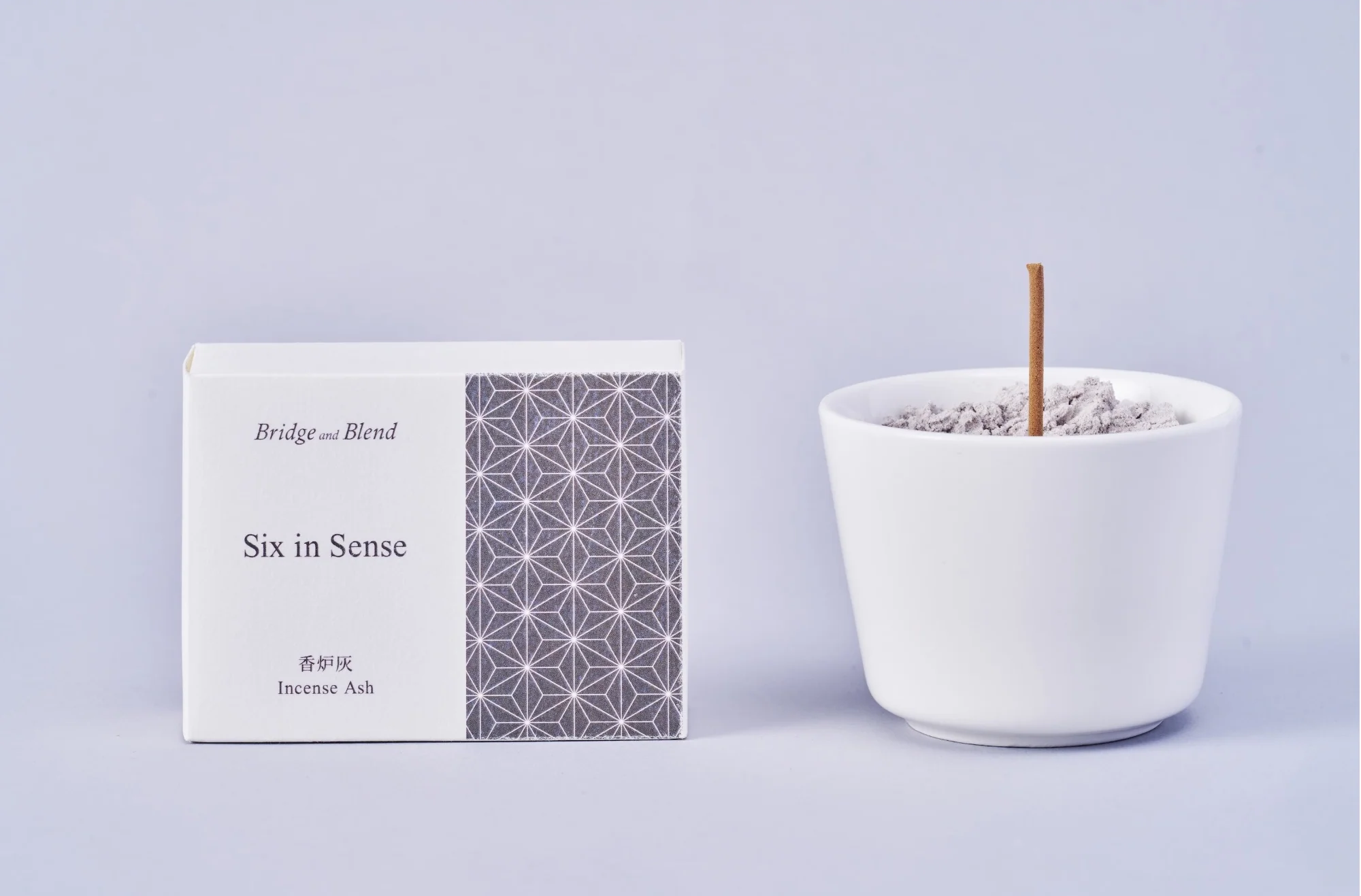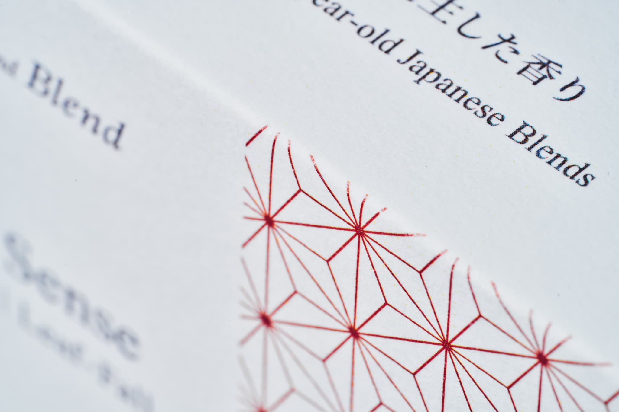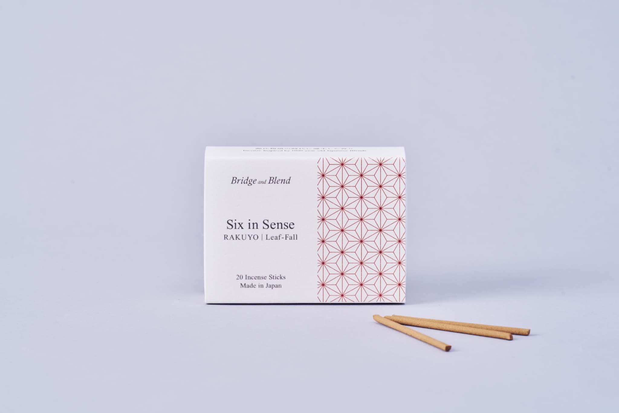 古代紋様の麻の葉を起用。この紋様にはBridge and Blend「Six in Sense」のコーン型お香をモチーフにした三角形と、この度リリースしたスティック型お香の直線が隠れており、俯瞰的に眺めると6つの香りを意図する六角形が浮き上がって見えます。